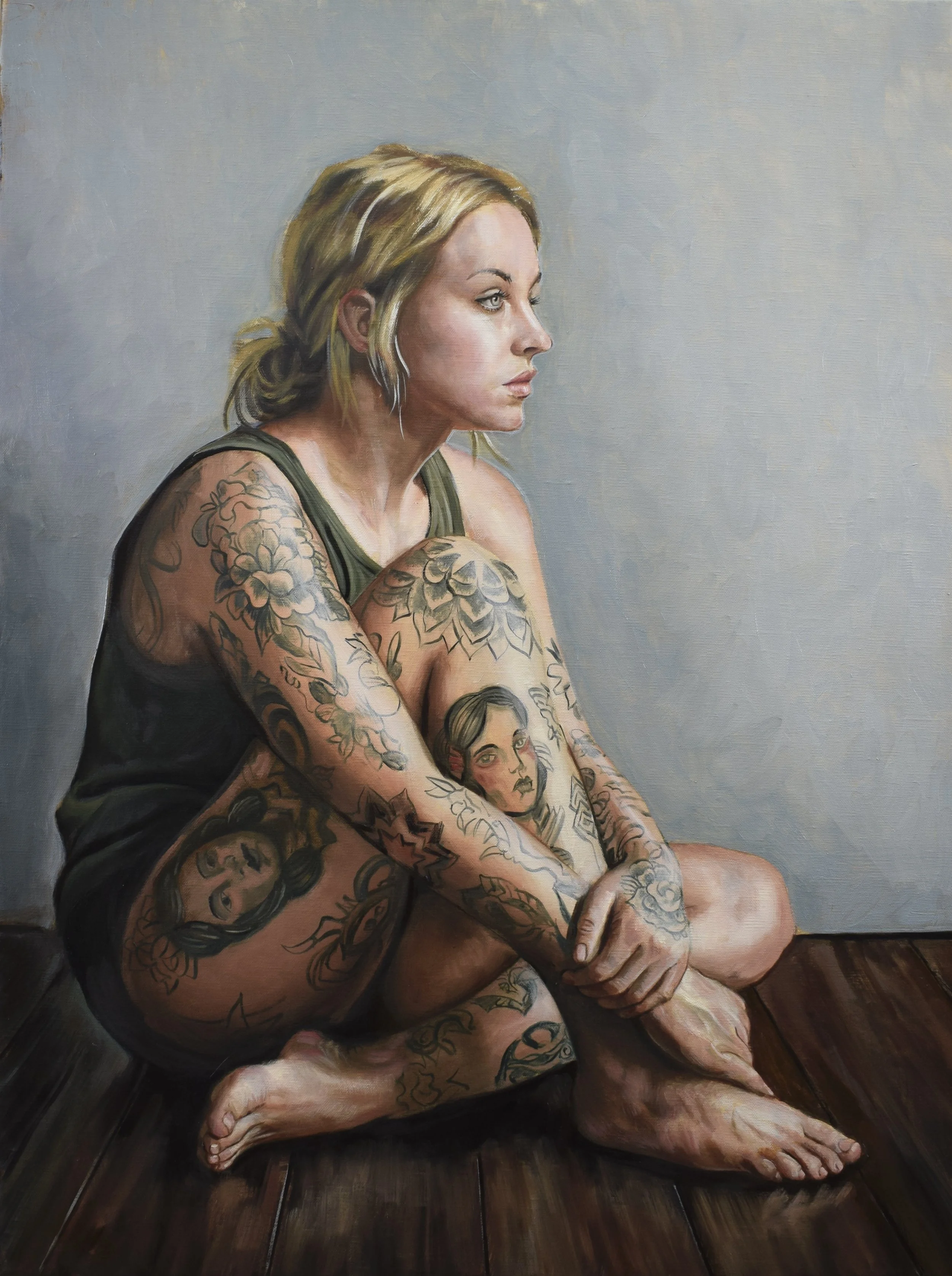 The reclining figure in The Rest of the Night further situates the exhibition within a long lineage of European painting, from Renaissance nudes to modern disruptions of the genre. Here, the subject’s ease and direct gaze reject idealization and passivity, offering instead a quiet assertion of bodily autonomy. Likewise, To the Bone and Under Her Skin shift toward introspection, presenting seated figures whose tattoos read less as surface decoration than as evidence of interior life — experiences absorbed, remembered, and carried.