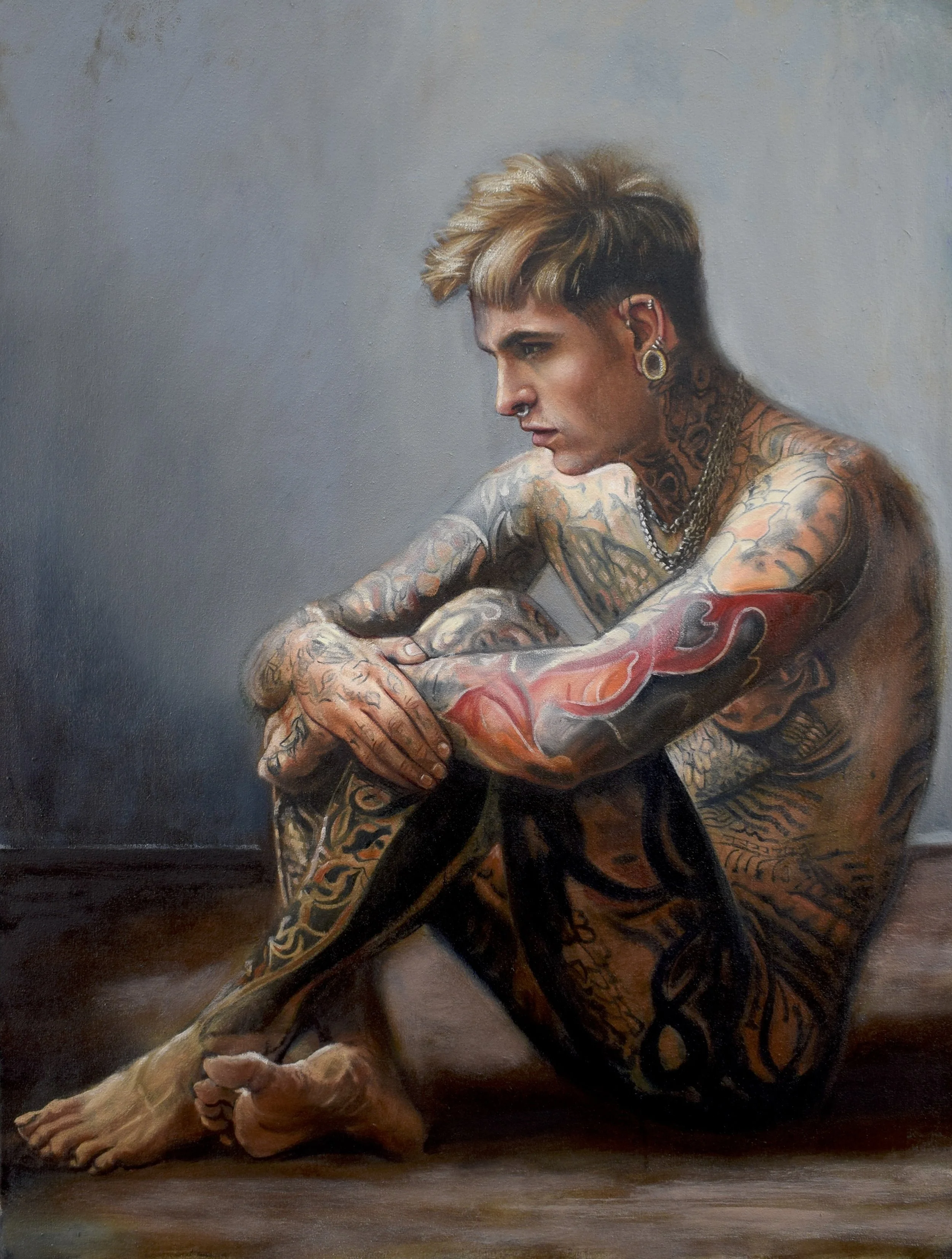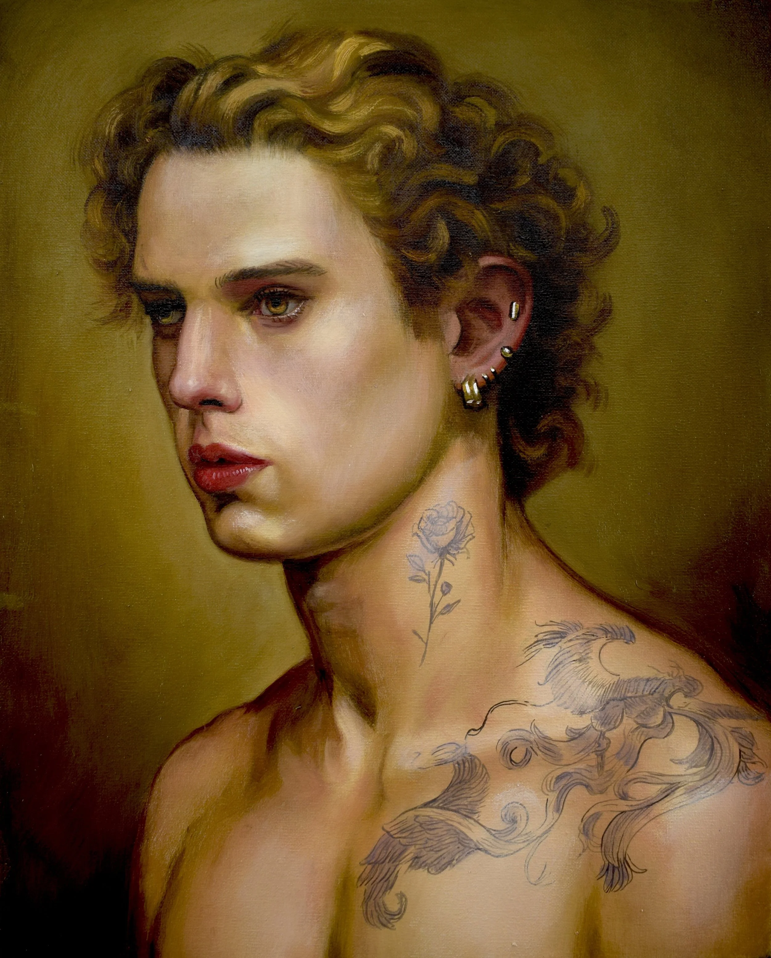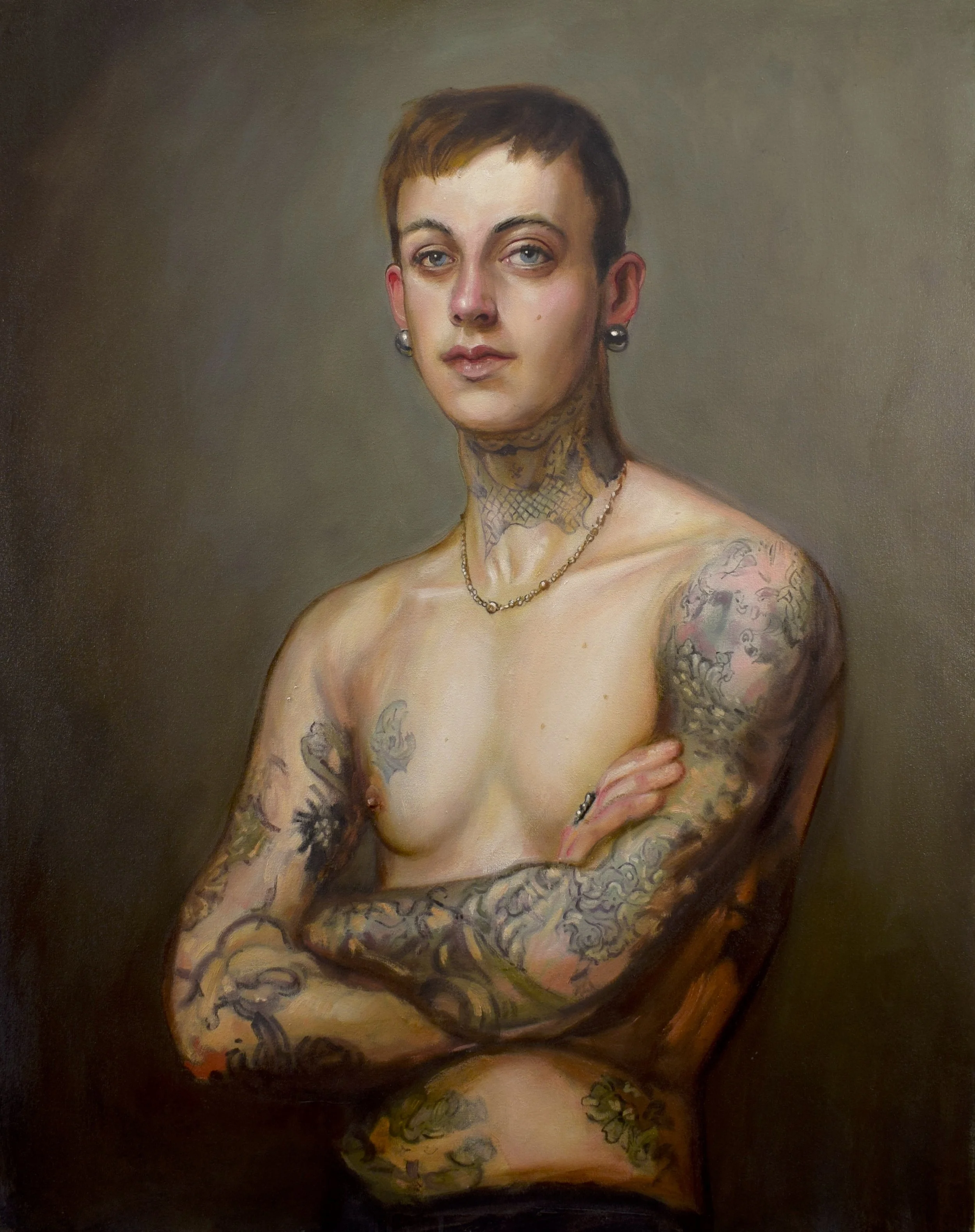 This tension between permanence and flux runs throughout the exhibition. Works such as In His Skin and Update draw on the formal structures of European portraiture — frontal gazes, profile views, composed stillness — while replacing historical symbols of class, profession, or lineage with contemporary signs of self-definition. Similarly, Heathen Son, Her True Heart, and Left in Wonder echo the balance, restraint, and attention to flesh found in historical portrait painting, yet shift meaning inward, allowing tattoos and posture to replace allegory and costume as carriers of identity.