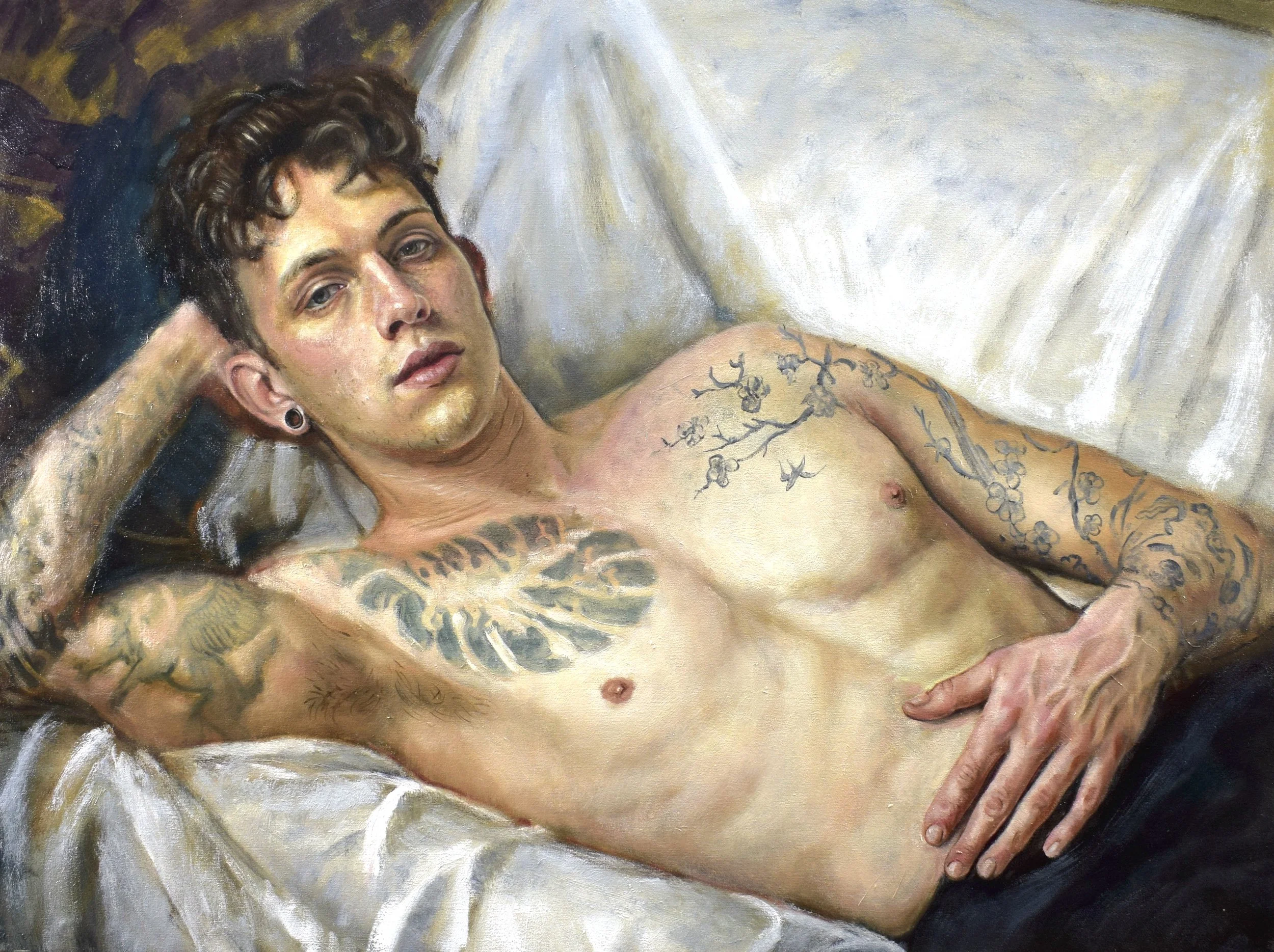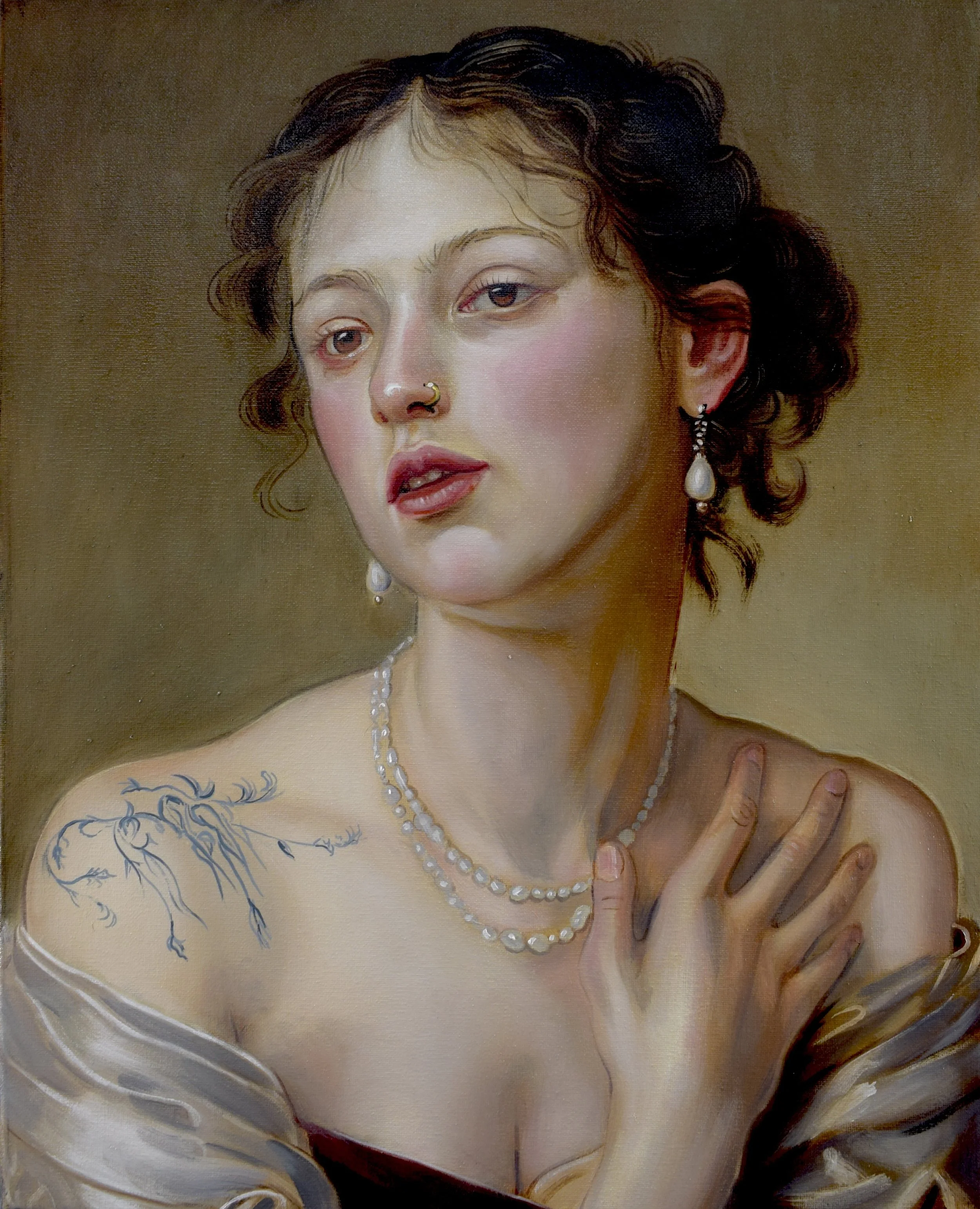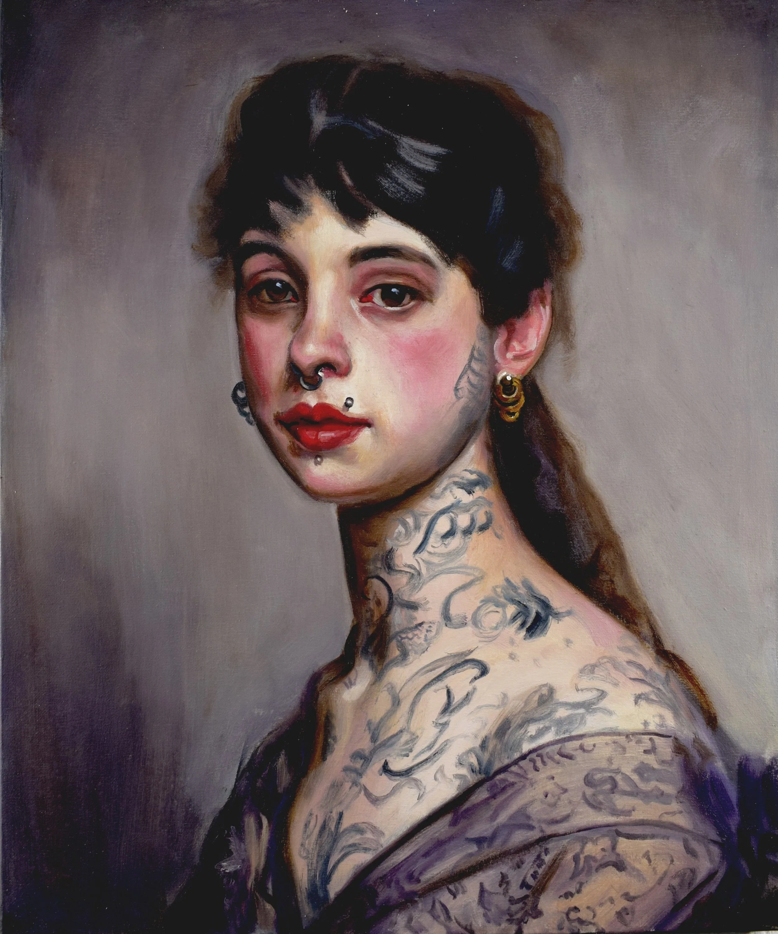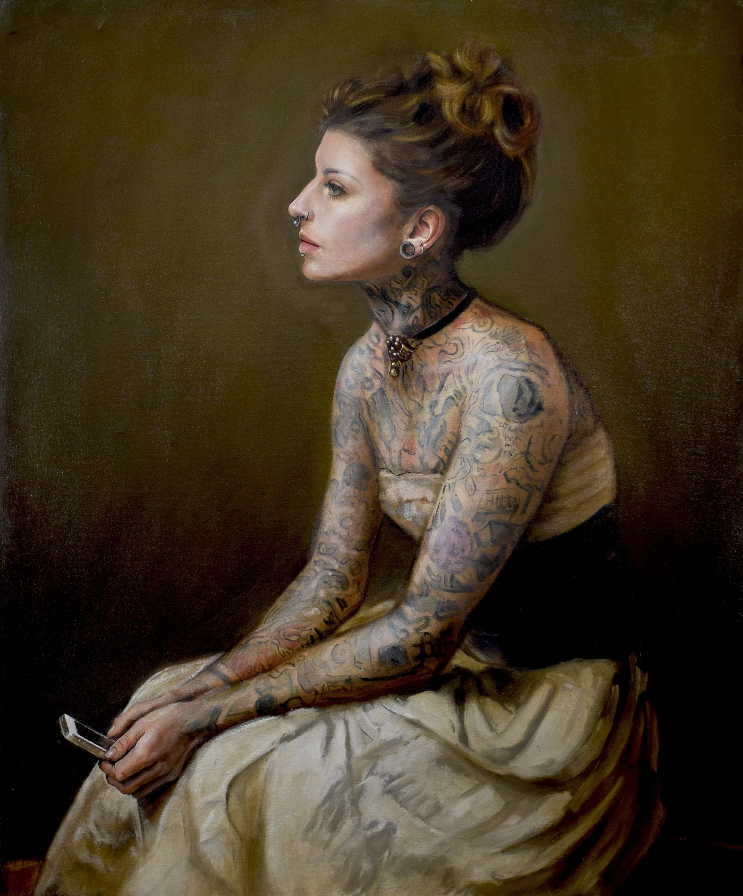 This tension between permanence and flux runs throughout the exhibition. Works such as In His Skin and Update draw on the formal structures of European portraiture — frontal gazes, profile views, composed stillness — while replacing historical symbols of class, profession, or lineage with contemporary signs of self-definition. Similarly, Heathen Son, Her True Heart, and Left in Wonder echo the balance, restraint, and attention to flesh found in historical portrait painting, yet shift meaning inward, allowing tattoos and posture to replace allegory and costume as carriers of identity.