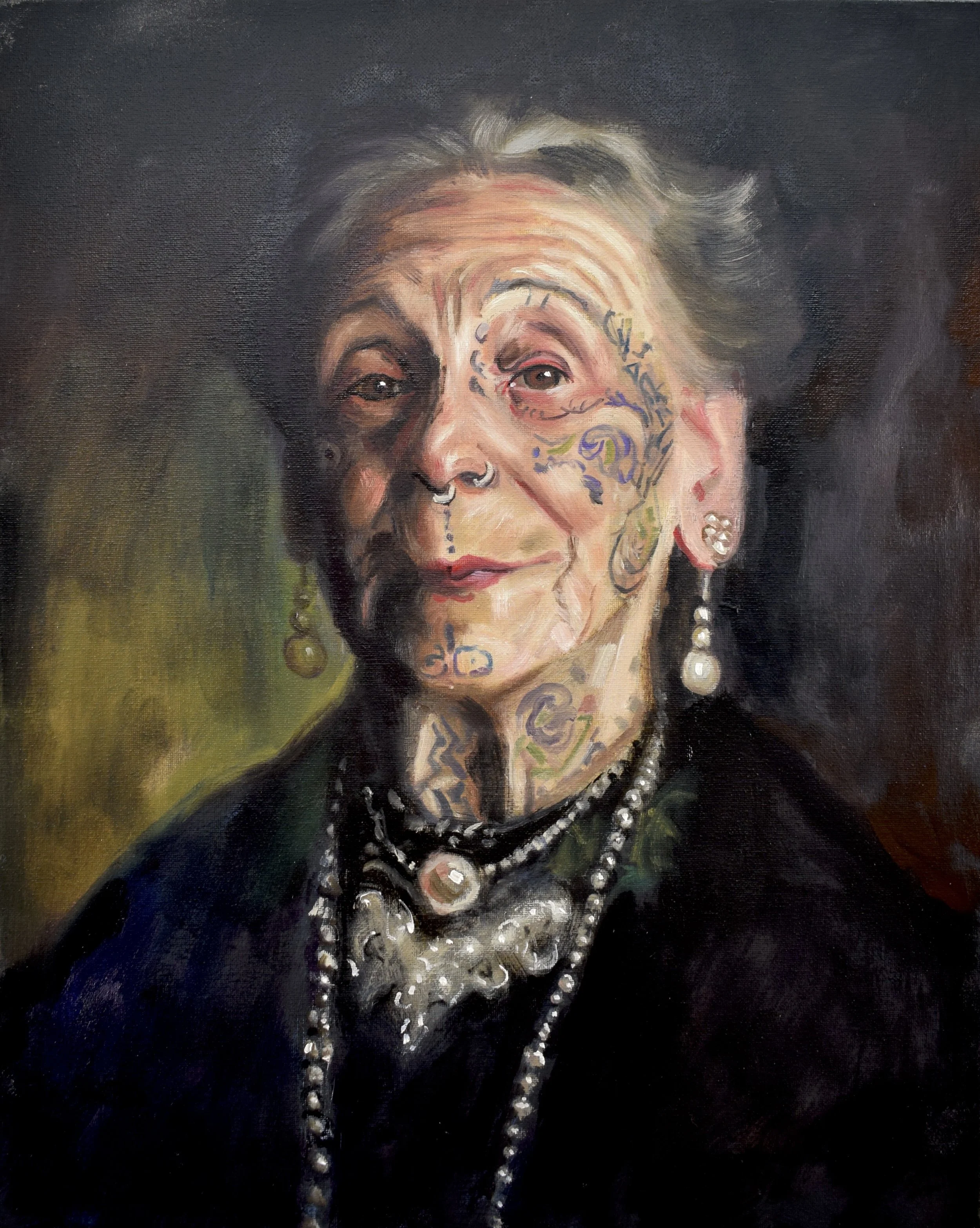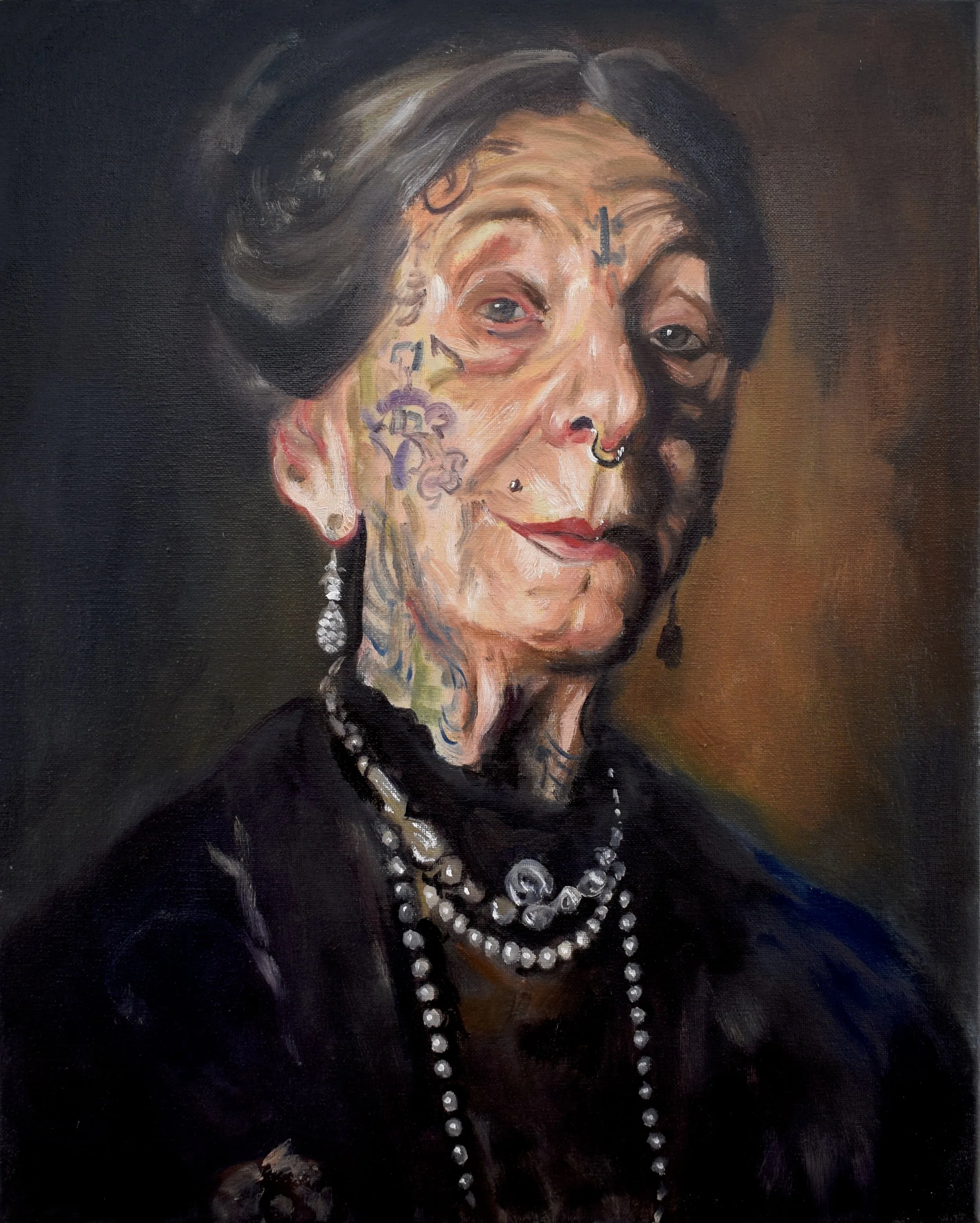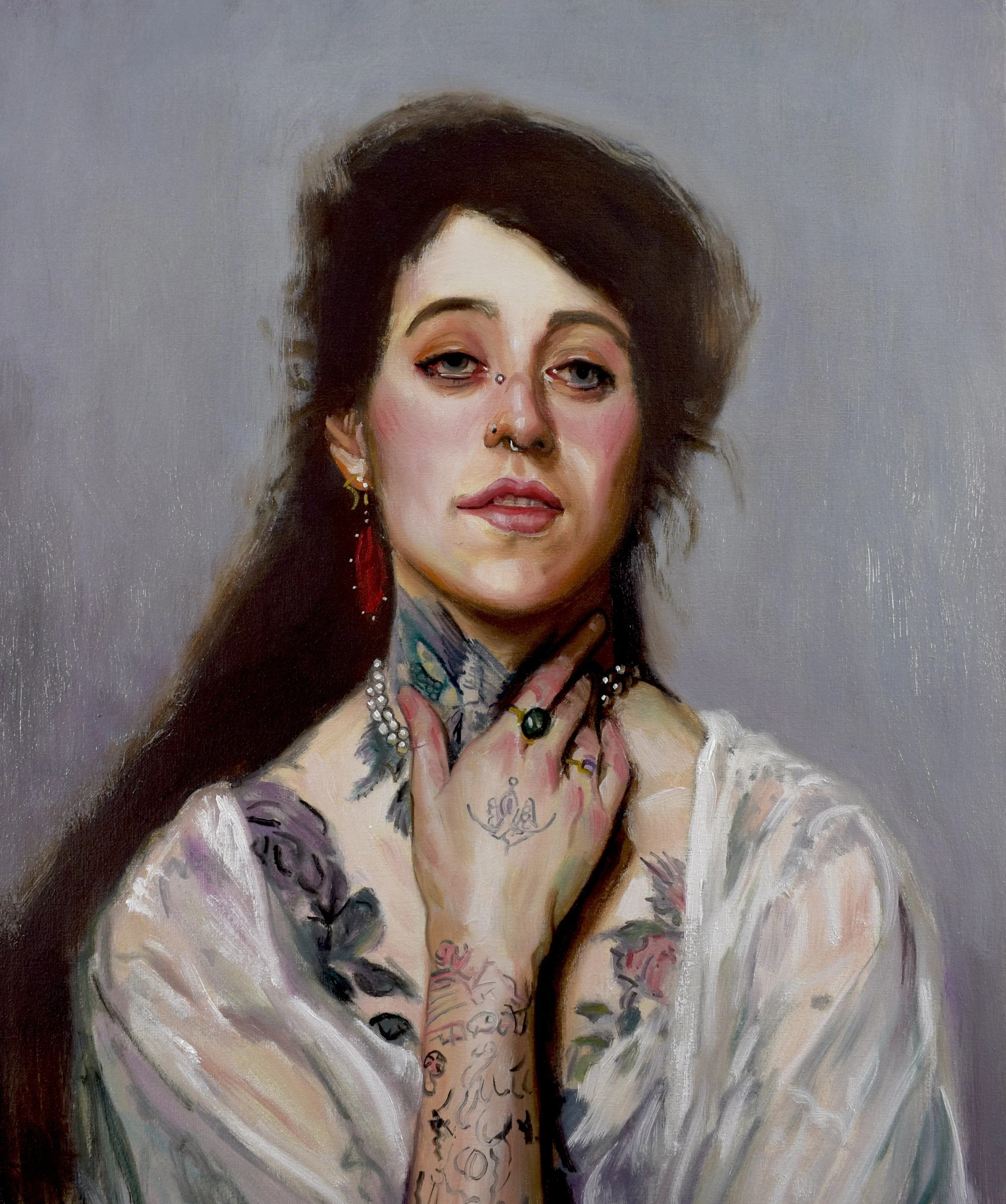 Questions of time and continuity surface in In One Person, When She Was Young, and When She Was Not So Young. Referencing John Irving’s novel, In One Person frames identity as plural and evolving, refusing singular definitions. The paired paintings When She Was Young and When She Was Not So Young complicate assumptions about age and biography: the women appear the same age, yet the titles destabilize linear narratives of experience. We do not know when their tattoos were acquired — a deliberate ambiguity that resists moral or generational readings of self-expression.